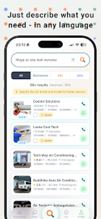 The application is tailored for Sri Lankan users, showcasing local businesses and classified ads across various categories. It supports multiple languages, including English, Sinhala, Tamil, and Singlish, making it accessible to a wide audience. Users can filter search results by distance and district, ensuring they find the most relevant options nearby. With no hidden fees, List.lk offers a straightforward platform for both consumers and businesses to engage in the local economy.